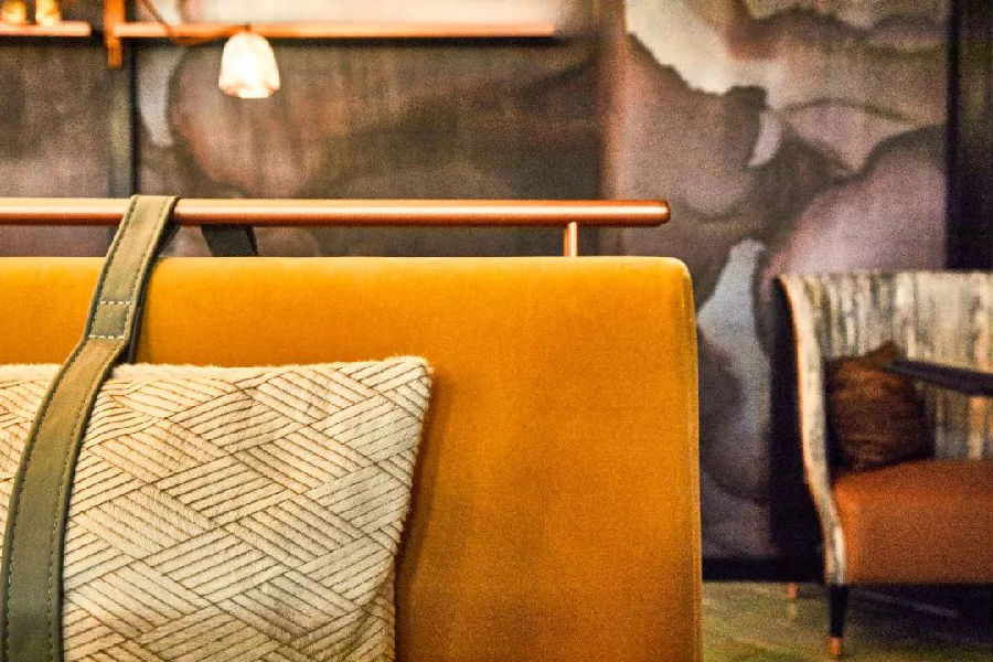 在餐厅最深处是超现实和意想不到的Spiegelsaal,一个私人用餐空间,是Jin Gui的宝石。这个空间以重叠的铜棒节奏将自己与其他空间分开,旋转到一个消失点,并通过一面镜子墙反射,创造出万花筒般的效果,将用餐者带入另一个世界。Spiegelsaal置身于未来主义与乡土、光滑与原始、幻想与熟悉的边缘地带。