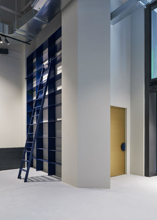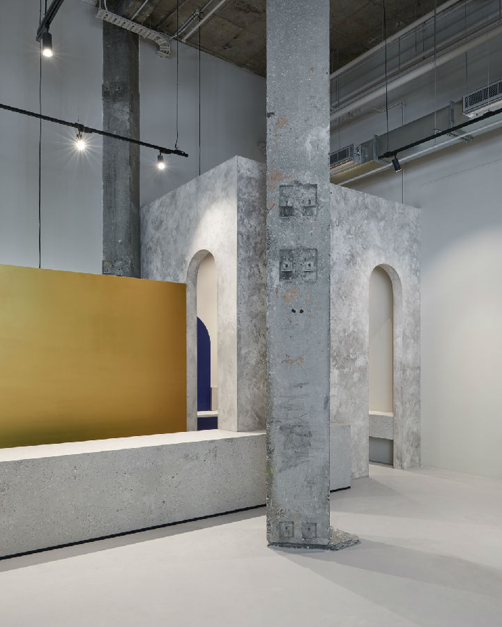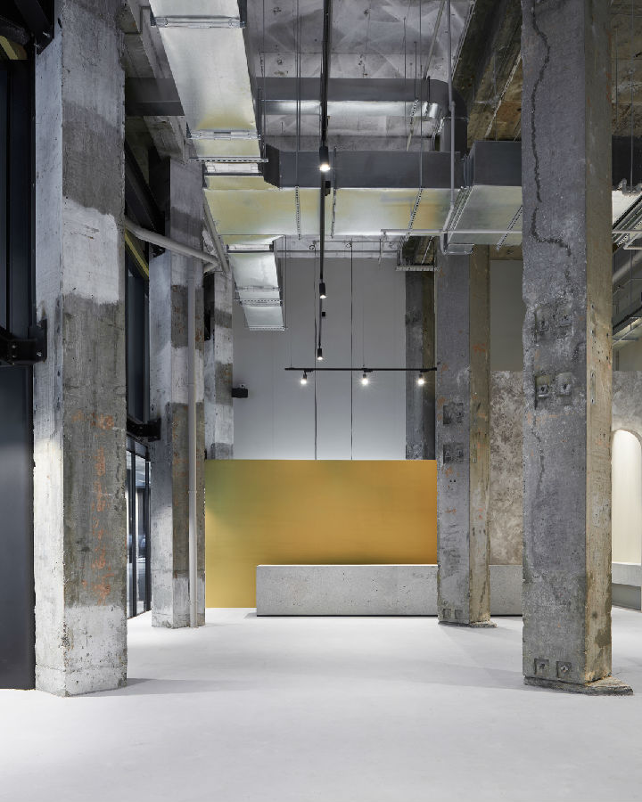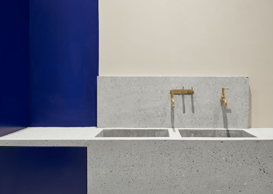 选择了蓝色、金色和黄铜的调色板来对比和补充裸露的混凝土柱的粗糙度,为工业色彩提供了时尚的威严和温暖。前面的柜台是一个纪念碑的混凝土和形式嵌入与海军蓝色细节。黄铜水龙头和配件在公用设施间的铸造混凝土槽中引起了阴谋。